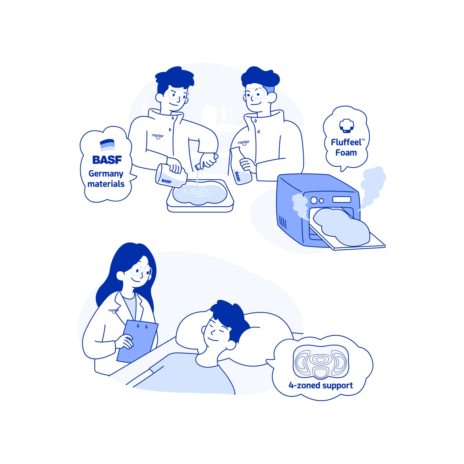 We started to look for the best suit ingredient. In the end, we teamed up with BASF from Germany to build a foam that gives the fluffy feel of "like pillow like bun". DING! The well-baked Fluffeel™ Foam is ready to be served!